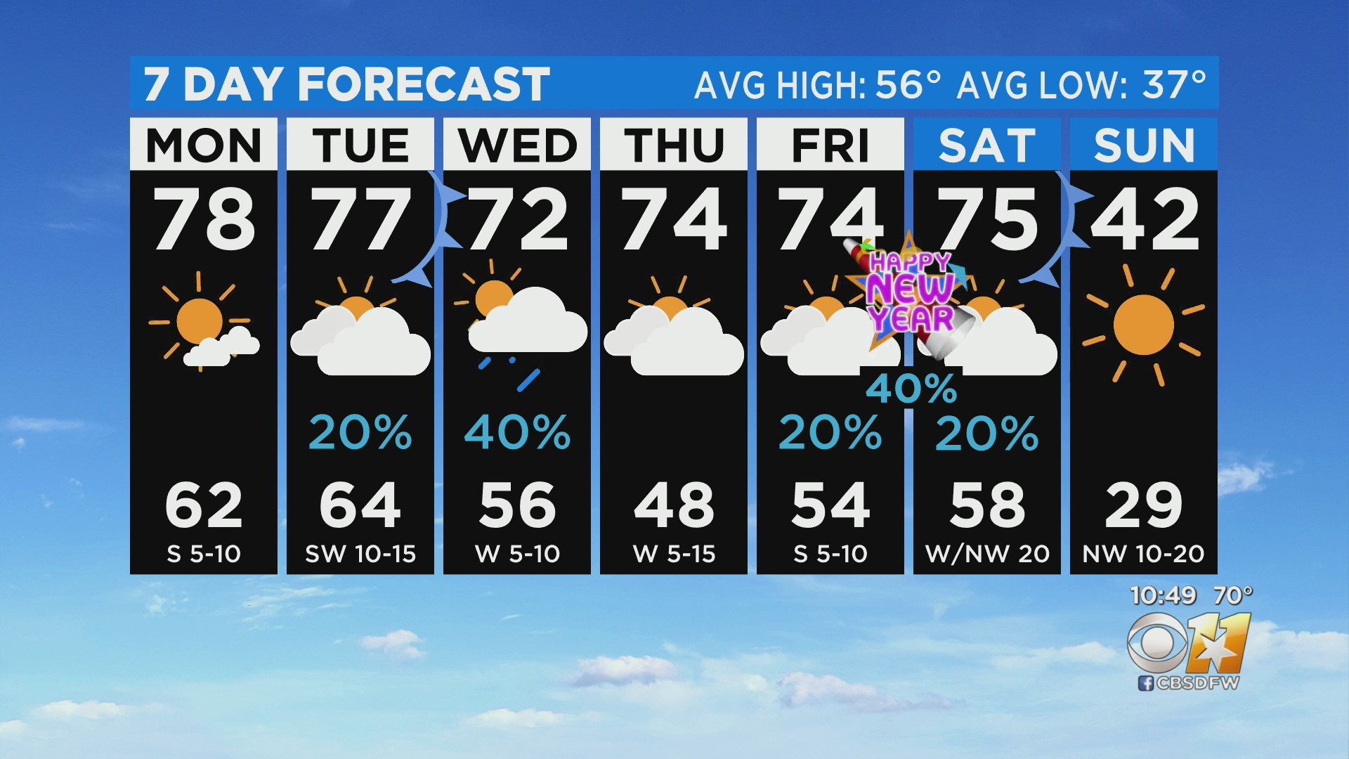 Fondness Continues Through New Year's Day, But Drastic Changes Onwards Temps will stay in the 70s for the next week, but a polar front could bring highs in the 40s and lows in the 20s after New Year's Day.